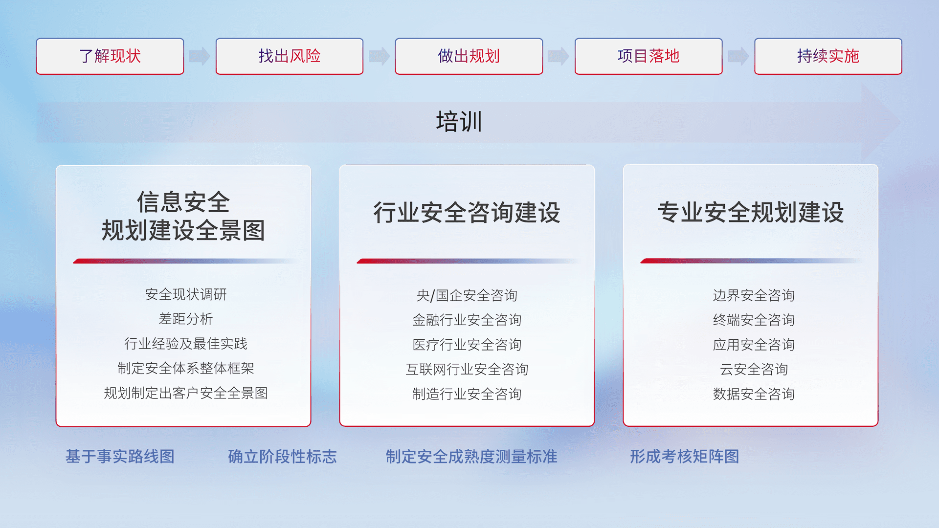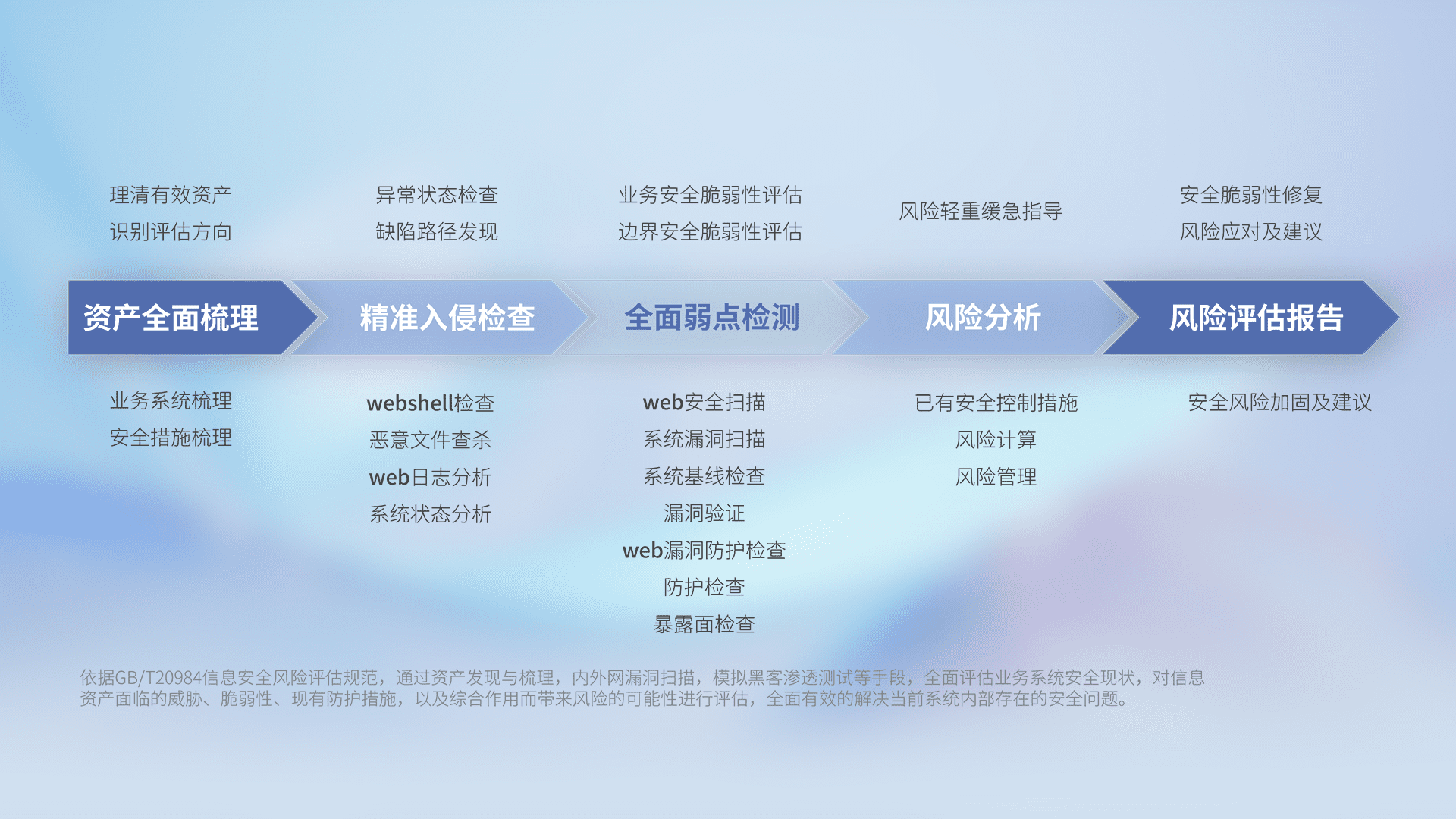 针对客户行业特性,,,,以专业的安全服务+多厂商联合解决方案提供专属的一站式安全管理服务,,,帮助客户全面感知网络空间威胁,,基于识别、、、检测、、、、分析、、、防护、、、、监测、、、响应的服务理论模型,,从方案咨询、、集成交付、、、、评估验证、、、优化加固、、运维运营,,致力于为客户提供完整的闭环管理式安全服务。。。。以实战经验为客户打造高抵御风险的安全体系,,帮助客户发现威胁、、对抗威胁、、、、处置威胁,,,不断积累安全对抗能力,,,,持续保障数字化安全。。。。